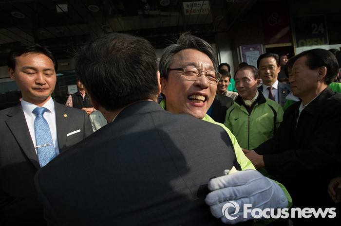 (서울=포커스뉴스) 총선 선거운동이 공식적으로 시작된 31일 오후 김성식 국민의당 관악갑 후보가 서울 관악구 관악플라자 앞에서 선거 유세를 하던 중 한 지지자와 포옹하고 있다.