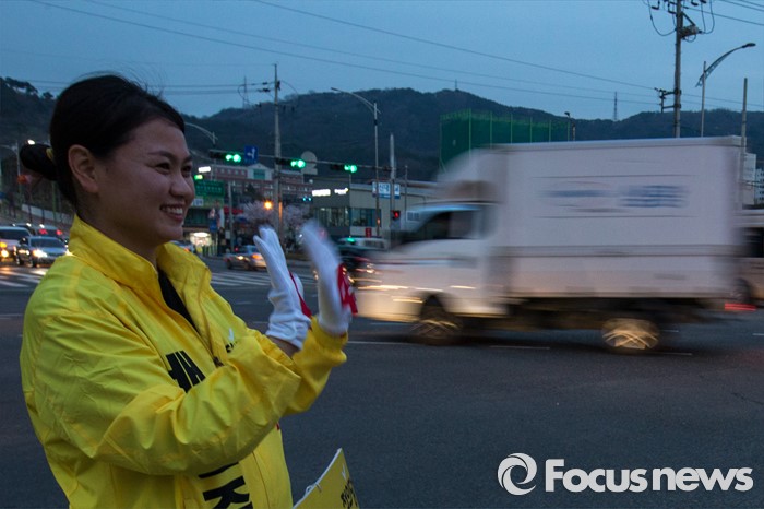 (경산=포커스뉴스) 정의당 경북 경산시 배윤주 후보가 31일 오후 경북 경산시 중앙병원 네거리에서 유권자들에게 한 표를 호소 하고 있다.