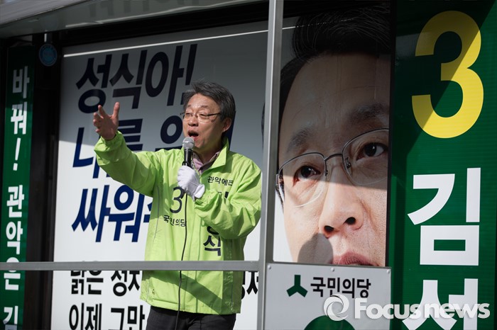 (서울=포커스뉴스) 총선 선거운동이 공식적으로 시작된 31일 오후 김성식 국민의당 관악갑 후보가 서울 관악구 관악플라자 앞에서 선거 유세를 하고 있다.