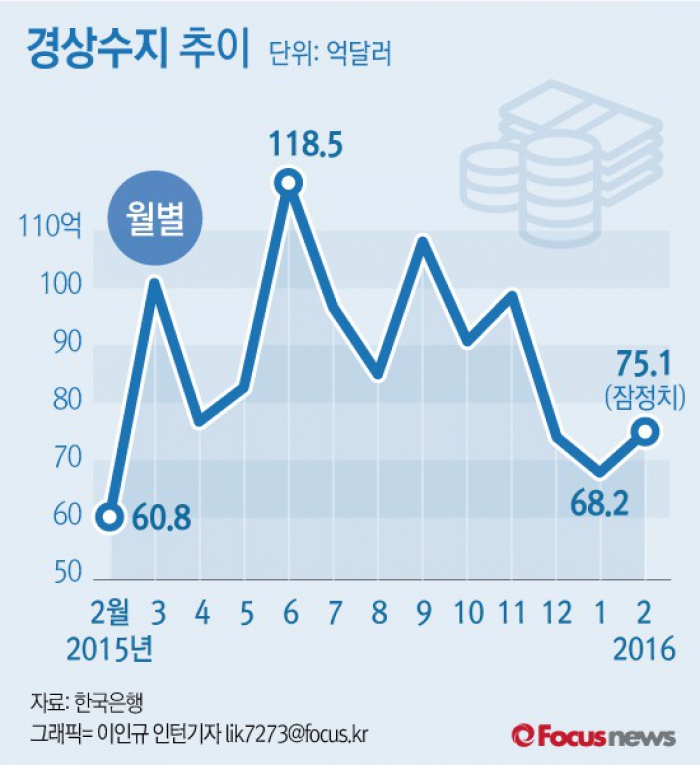 (서울=포커스뉴스) 1일 한국은행이 발표한 2월 국제수지 잠정치 자료에 따르면 2월 경상수지는 75억1000만달러로 48개월째 흑자를 이어갔다. 수출보다 수입이 크게 줄면서 나타나는 ‘불황형 흑자’ 양상은 지속돼 우려를 사고 있다.