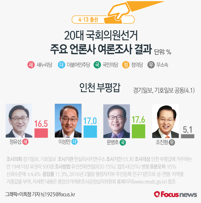 이번 여론조사는 지난달 30일 인천 부평갑에 거주하는 만 19세 이상 남녀 500명을 대상으로 유선전화 임의전화번호 걸기(RDD)와 모바일 조사를 병행해 진행됐다. 표본오차는 95% 신뢰수준에 ±4.4%포인트다. 자세한 내용은 중앙선거여론조사공정심의위원회 홈페이지(www.nesdc.go.kr)에서 찾아볼 수 있다.(서울=포커스뉴스) 경기일보, 기호일보가 한길리서치연구소에 의뢰해 1일 발표한 여론조사 결과에 따르면 새누리당 정유섭 후보의 지지율은 16.5%, 더불어민주당 이성만 후보의 지지율은 17.0%, 국민의당 문병호 후보는 17.6%, 무소속 조진형 후보는 5.1%를 기록했다.2016.04.01 이희정 기자