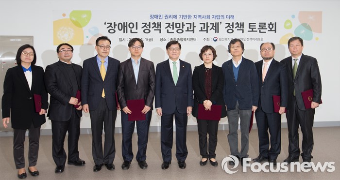 (세종=포커스뉴스) 정진엽 보건복지부장관이 1일 오전 세종시 종촌종합복지센터 대회의실에서 '장애인정책의 전망과 과제'라는 주제로 열린 정책 토론회에 참석해 장애인정책미래포럼 위촉장을 수여하고 기념촬영하고 있다.