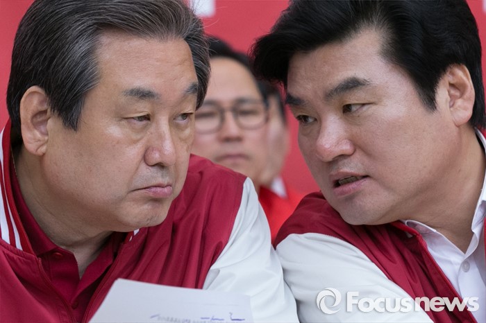 (수원=포커스뉴스) 김무성(왼쪽) 새누리당 대표와 원유철 원내대표가 1일 오전 경기도 수원시 장안구 정조로 새누리당 경기도당에서 열린 중앙선대위 회의에 참석해, 대화하고 있다.