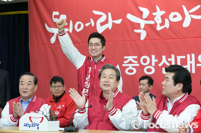 (수원=포커스뉴스) 새누리당 공동선대위원장인 김무성(가운데) 대표와 원유철(오른쪽) 원내대표, 서청원 최고위원이 1일 오전 경기도 수원시 장안구 정조로 새누리당 경기도당에서 열린 중앙선대위 회의에 참석해, 김상민 수원을 후보를 향해 박수치고 있다.