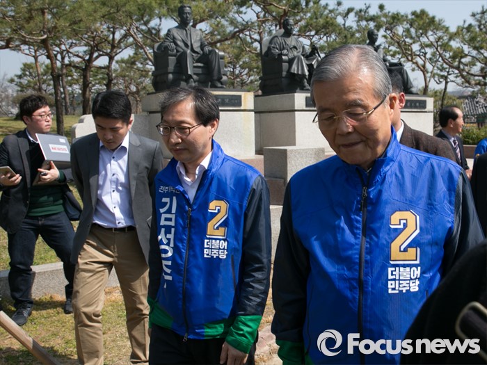 (전주=포커스뉴스) 1일 오전 전북 전주시 덕진공원을 방문한 김종인(오른쪽) 더불어민주당 비대위 대표 겸 선대위원장과 김성주 전주병 후보가 김 대표의 조부인 가인 김병로 선생 등 '법조 3성' 동상을 둘러본 뒤 이동하고 있다.