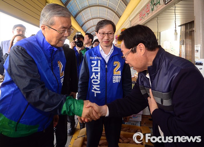 (전주=포커스뉴스) 1일 오전 전북 전주 모래내시장을 방문한 김종인 더불어민주당 비대위 대표 겸 선대위원장과 김성주 전주병 후보가 상인들과 인사하며 지지를 호소하고 있다.