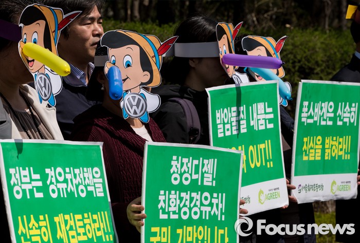 (서울=포커스뉴스) 1일 오전 서울 서초구 서울중앙지법에서 피노키오 탈을 쓴 서민민생대책위원회, 서울환경연합 회원들이 '아우디ㆍ폭스바겐 규탄 및 피해보상 촉구' 기자회견을 열고 있다.