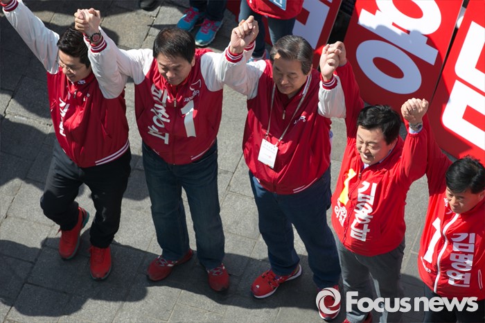 (수원=포커스뉴스) 김무성(가운데) 새누리당 대표가 1일 오전 경기도 수원시 팔달구 수원역 로데오거리 입구에서 열린 새누리당 수원지역 후보자 합동 유세에 참석해 손을 들고 있다.