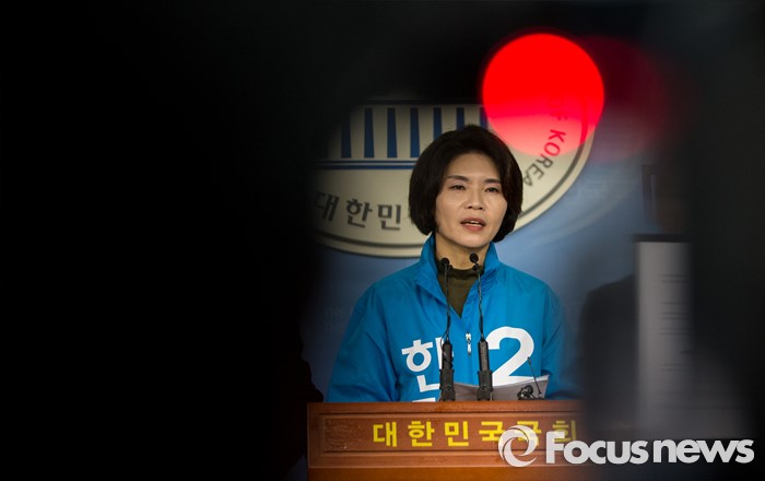 (서울=포커스뉴스) 한정애 더불어민주당 강서병 후보가 1일 오후 서울 여의도 국회 정론관에서 국민의당 김성호 후보와 단일화에 대한 기자회견을 하고 있다. 서울 강서병 지역 한정애 더민주 후보, 김성호 국민의당 후보 간의 단일화는 첫 수도권 단일화 합의로 관심을 모았으나 당명 사용 문제가 해결되지 않아 진통을 겪을 예상이다.