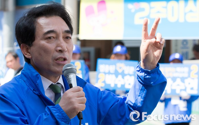 (공주=포커스뉴스) 1일 충남 공주시 산성시장 일원에서 박수현 더불어민주당 후보가 지지를 호소하고 있다.
