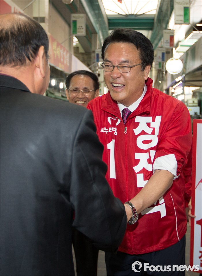 (공주=포커스뉴스) 1일 충남 공주시 산성시장 일원에서 정진석 새누리당 후보가 지지를 호소하고 있다.