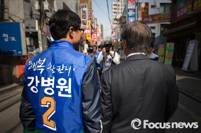 (서울=포커스뉴스) 1일 오후 문재인 전 더불어민주당 대표가 서울 은평구 연신내역 앞에서 강병원 은평을 후보와 함께 유세를 하고 있다.