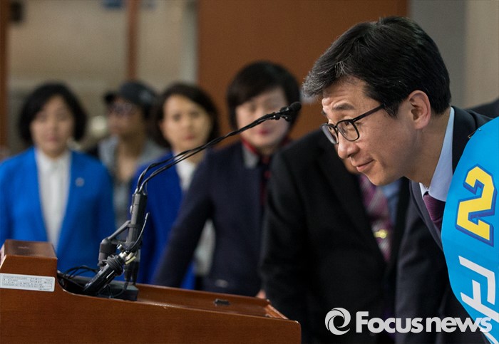 (서울=포커스뉴스) 고용진 더불어민주당 노원갑 후보가 1일 오후 서울 여의도 국회 정론관에서 야권단일화 공식 제안 기자회견에 앞서 인사하고 있다. 고 후보는 이날 기자회견에서 이형남 국민의당 후보에게 모든 조건을 수용할테니 단일화에 응할 것을 제안했다.