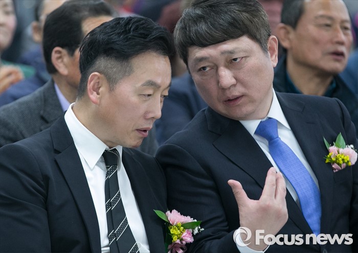 (익산=포커스뉴스) 최재성(오른쪽) 더불어민주당 의원이 정봉주 전 의원이 1일 오후 한병도 전북 익산을 후보 선거사무소에서 열린 개소식에 참석해 대화하고 있다.