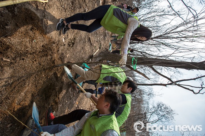(서울=포커스뉴스) 1일 오후 서울 동대문구 배봉산에서 동대문구청 직원들이 식목일을 앞두고 나무를 심고 있다.