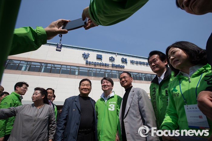(안산=포커스뉴스) 안철수 국민의당 상임공동대표가 1일 오후 안산시 상록구 상록수역 월드프라자 앞에서 김영환 상록구을 후보와 박주원 상록구갑 후보 지원 유세를 하던 중 지지자들과 기념사진을 찍고 있다.