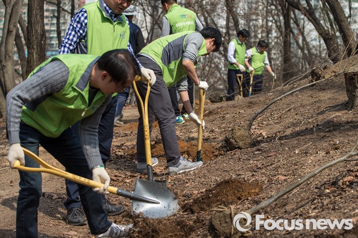 (서울=포커스뉴스) 1일 오후 서울 동대문구 배봉산에서 동대문구청 직원들이 식목일을 앞두고 나무를 심고 있다.