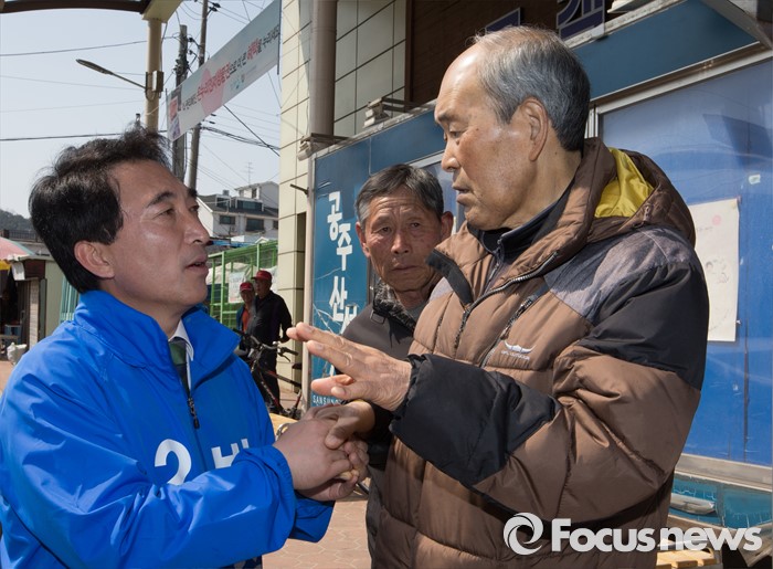 (공주=포커스뉴스) 1일 충남 공주시 산성시장 일원에서 박수현 더불어민주당 후보가 지지를 호소하고 있다.