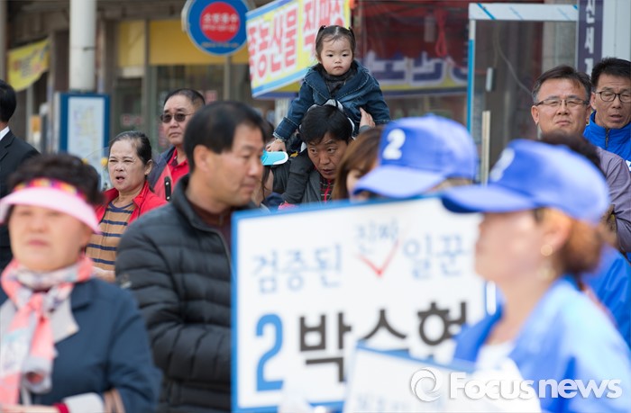 (공주=포커스뉴스) 1일 충남 공주시 산성시장 일원에서 어린이가 박수현 더불어민주당 후보의 연설에 관심을 보이고 있다.