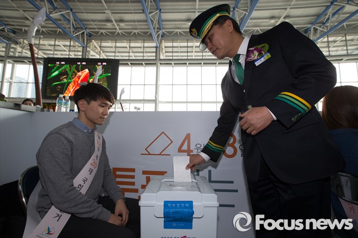 (서울=포커스뉴스) 1일 오후 서울 용산구 서울역사에 설치된 제20대 국회의원선거 투표참여 홍보관에서 류정민 서울역장이 사전투표 체험을 하고 있다. 체험관은 이달 1일부터 6일까지 운영한다.