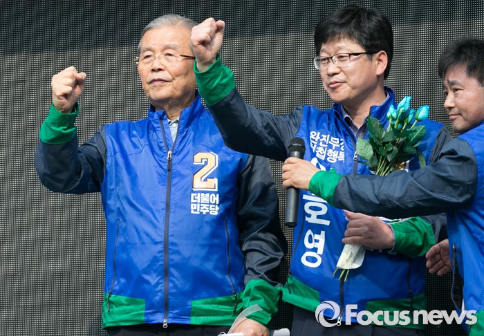 (완주=포커스뉴스) 1일 오후 전북 완주군 둔산공원 앞 사거리에서 김종인(왼쪽) 더불어민주당 비대위 대표 겸 선대위원장과 안호영 완주·진안·무주·장수군 후보가 파이팅을 외치며 포즈를 취하고 있다.