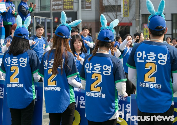 (완주=포커스뉴스) 1일 오후 전북 완주군 둔산공원 앞 사거리에서 안호영 더불어민주당 완주·진안·무주·장수군 후보 선거운동원과 유세단이 지지를 호소하고 있다.