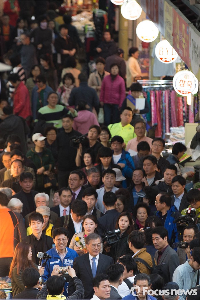 (서울=포커스뉴스) 1일 오후 문재인 전 더불어민주당 대표가 서울 강서구 방신재래시장에서 진성준 강서을 후보와 함께 유세를 하고 있다.