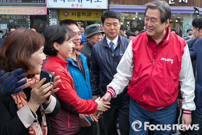 (시흥=포커스뉴스) 김무성 새누리당 대표가 1일 오후 경기도 시흥시 삼미시장 입구에서 함진규 시흥갑 후보 지원 유세를 마친 뒤, 시민들과 악수하고 있다.