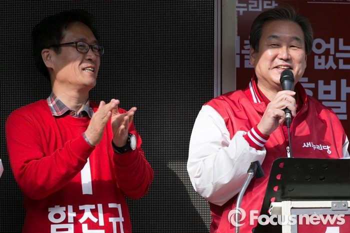 (시흥=포커스뉴스) 김무성(오른쪽) 새누리당 대표가 1일 오후 경기도 시흥시 삼미시장 입구에서함진규 시흥갑 후보 지원 유세를 하고 있다.