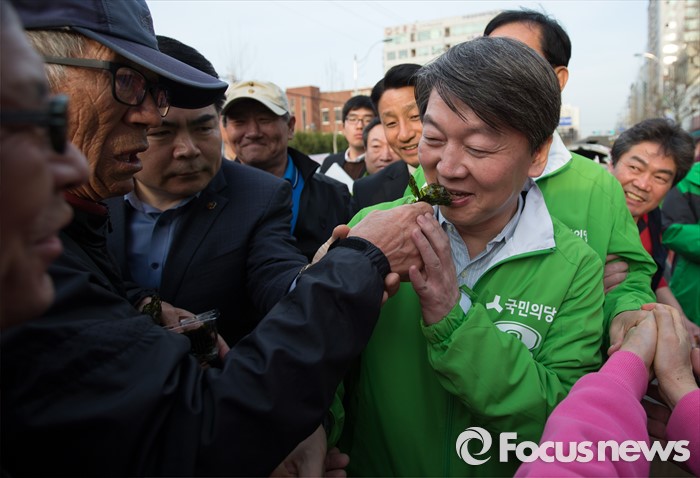 (인천=포커스뉴스) 안철수 국민의당 상임공동대표가 1일 오후 인천시 부평구 부평 4동에서 문병호 부평구갑 후보 지원 유세를 하던 중 한 노인이 안 대표에게 김을 먹이려하고 있다.