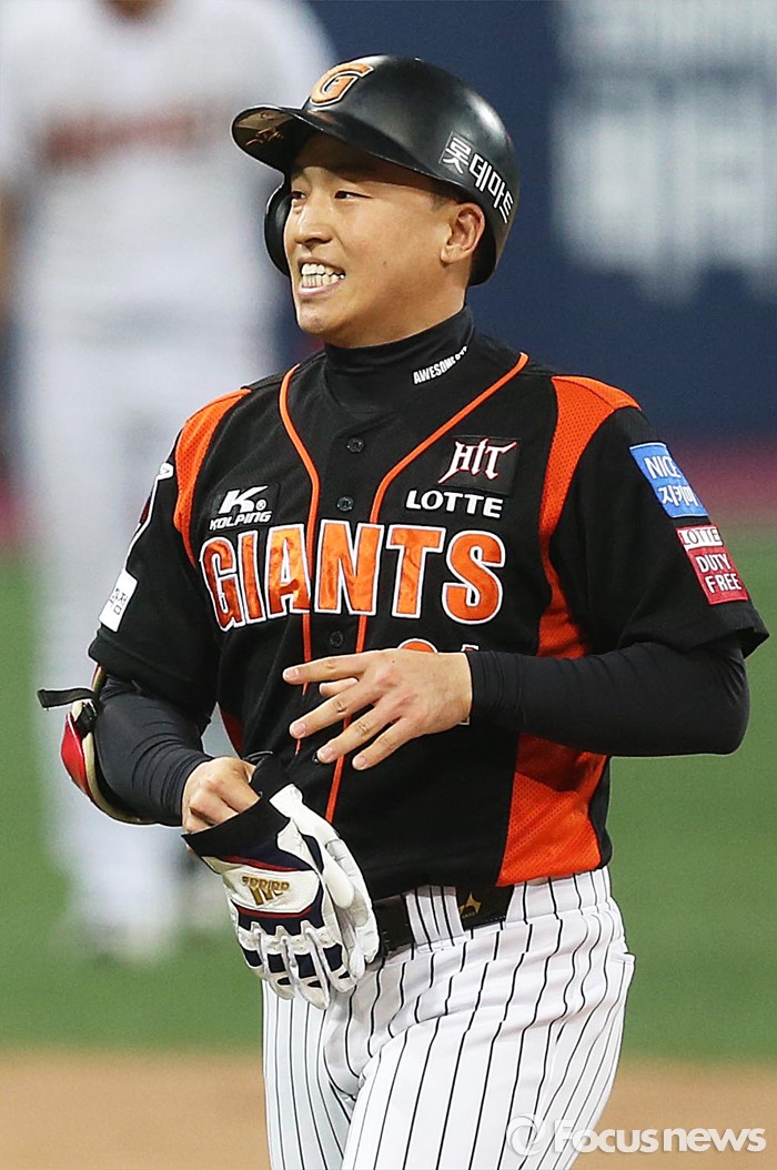 (서울=포커스뉴스) 1일 오후 서울 구로구 고척스카이돔에서 열린 2016 타이어뱅크 프로야구 개막전 넥센 히어로즈와 롯데 자이언츠의 경기 3회초 1사 상황 롯데 손아섭이 2루타를 친 뒤 미소를 짓고 있다.