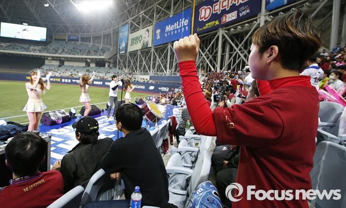 (서울=포커스뉴스) 1일 오후 서울 구로구 고척스카이돔에서 열린 2016 타이어뱅크 프로야구 개막전 넥센 히어로즈와 롯데 자이언츠의 경기에서 관중이 응원 하고 있다.
