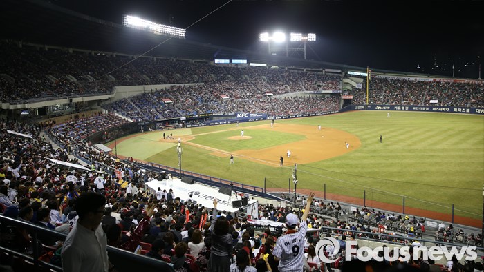 (서울=포커스뉴스) 1일 2016 프로야구 개막전 한화-LG 경기가 열린 서울 잠실구장엔 평일임에도 불구하고 팬들이 구장을 가득 메우며 열기를 북돋우고 있다.
