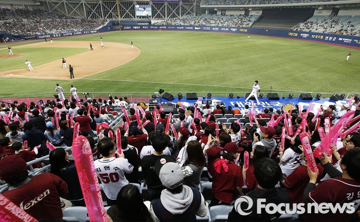 (서울=포커스뉴스) 1일 오후 서울 구로구 고척스카이돔에서 열린 2016 타이어뱅크 프로야구 개막전 넥센 히어로즈와 롯데 자이언츠의 경기에서 관중들이 응원을 펼치고 ㅣㅇㅆ다.