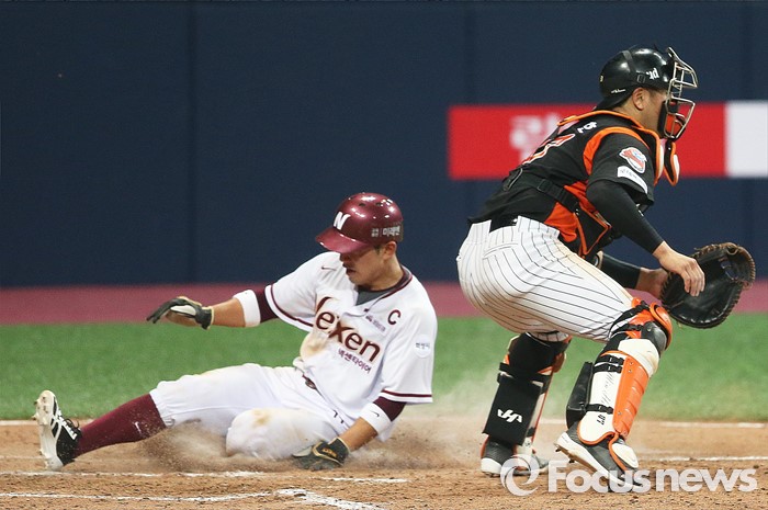 (서울=포커스뉴스) 1일 오후 서울 구로구 고척스카이돔에서 열린 2016 타이어뱅크 프로야구 개막전 넥센 히어로즈와 롯데 자이언츠의 경기 7회말 1사 3루 상황 넥센 이택근이 친 희생 플라이에 서건창이 홈을 밟고 있다.
