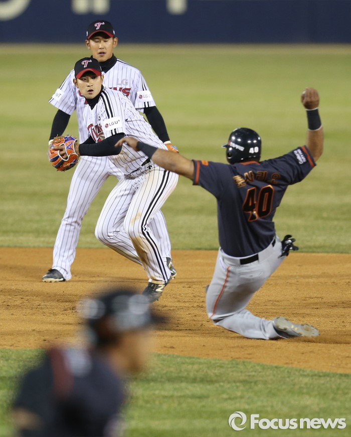 (서울=포커스뉴스) 1일 서울 잠실구장에서 열린 2016프로야구 개막전 한화-LG 경기5회초 1사 1,3루에서 한화 최진행의 2루 땅볼때 LG 유격수 강승호가 볼을 잡아 2루를 태그해 로사리오를 아웃시킨후 1루로 송구하고 있다. 병살플레이 성공.
