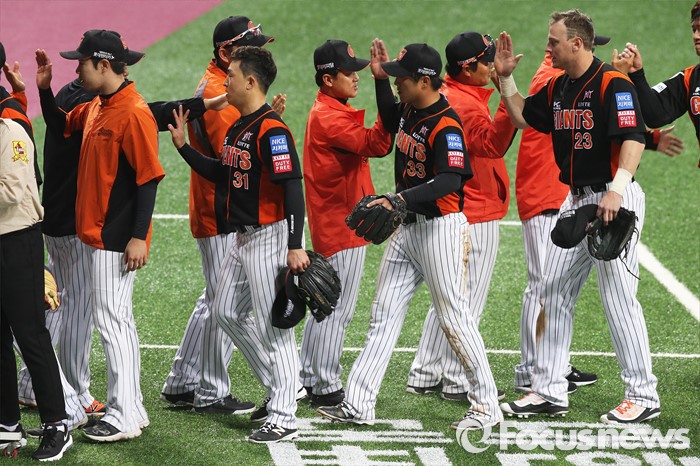 (서울=포커스뉴스) 1일 오후 서울 구로구 고척스카이돔에서 열린 2016 타이어뱅크 프로야구 개막전 넥센 히어로즈와 롯데 자이언츠의 경기에서 롯데가 2:1로 승리한 후 환호하고 있다.