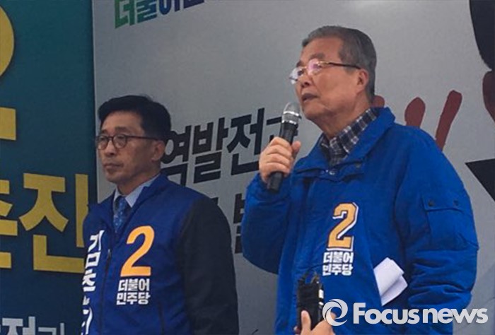 (김제=포커스뉴스) 김종인(오른쪽) 더불어민주당 비대위 대표 겸 선대위원장이 2일 오전 전북 김제 전통시장에서 열린 김춘진 김제·부안 후보 지원 유세에 참석해 지지를 호소하고 있다.