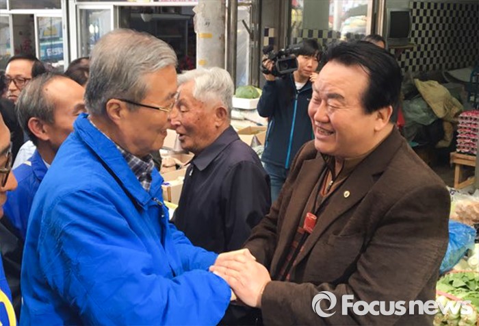 (김제=포커스뉴스) 2일 오전 전북 김제 전통시장을 방문한 김종인(왼쪽) 더불어민주당 비대위 대표 겸 선대위원장이 김춘진 김제·부안 후보 유세에 참석해 상인들과 인사하며 지지를 호소하고 있다.