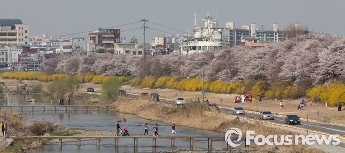 (청주=포커스뉴스) 화창한 날씨를 보인 2일 오후 충북 청주시 무심천 일원에 벚꽃이 만개해 많은 시민들이 여유로운 주말을 즐기고 있다.