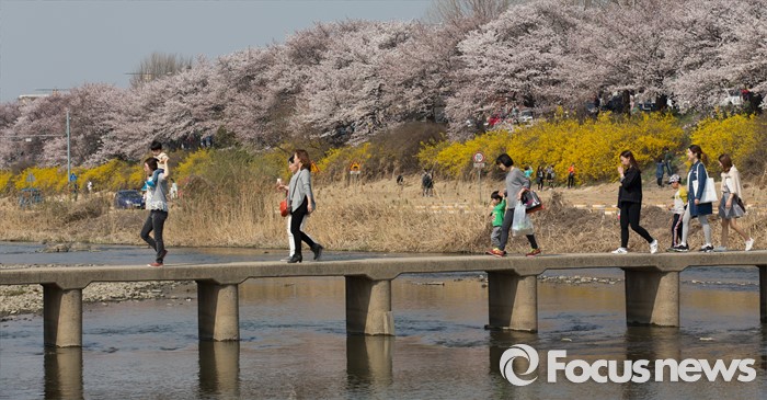 (청주=포커스뉴스) 화창한 날씨를 보인 2일 오후 충북 청주시 무심천 일원에 벚꽃이 만개해 많은 시민들이 여유로운 주말을 즐기고 있다.