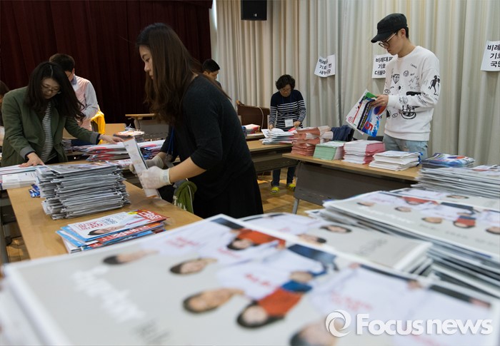 (서울=포커스뉴스) 2일 오후 서울 성북구 안암동주민센터에서 관계자들이 가정으로 발송될 제20대 국회의원 선거 공보물을 정리하고 있다.