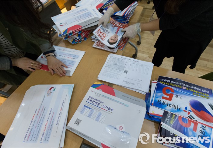 (서울=포커스뉴스) 2일 오후 서울 성북구 안암동주민센터에서 관계자들이 가정으로 발송될 제20대 국회의원 선거 공보물을 정리하고 있다.