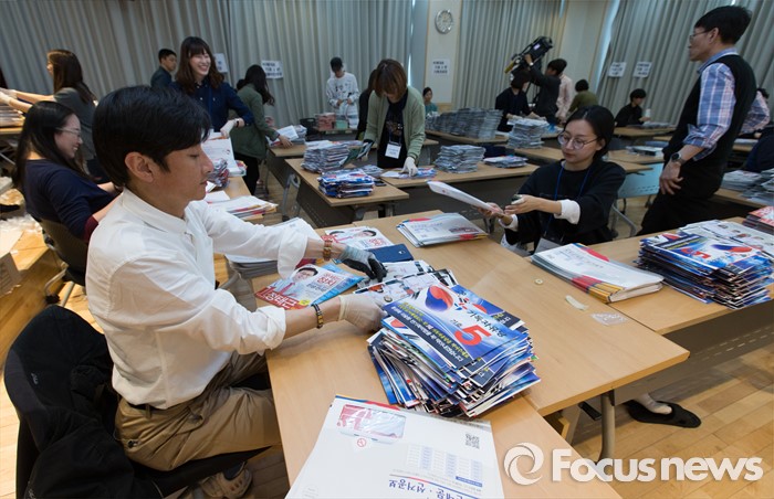 (서울=포커스뉴스) 2일 오후 서울 성북구 안암동주민센터에서 관계자들이 가정으로 발송될 제20대 국회의원 선거 공보물을 정리하고 있다.