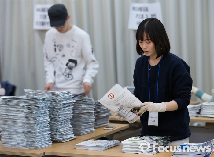 (서울=포커스뉴스) 2일 오후 서울 성북구 안암동주민센터에서 관계자들이 가정으로 발송될 제20대 국회의원 선거 공보물을 정리하고 있다.