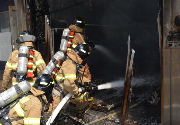 소방당국은 드라이클리닝 작업 중 불이 났다는 신고를 참고해 정확한 화재 원인을 조사하고 있다.2일 오전 11시 33분 서울 양천구 신월동 한 세탁소에서 불이 나 소방관들이 불을 끄고 있다. <사진제공=서울 양천소방서>
