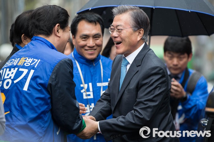 (서울=포커스뉴스) 선거운동이 시작되고 첫 주말을 맞은 3일 오전 문재인 전 더불어민주당 대표가 서울 동작구 신대방성당을 찾아 김병기 더민주 동작갑 후보와 악수를 하고 있다.