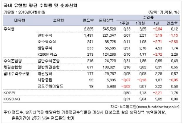 3일 펀드평가사 KG제로인이 지난 1일 공시된 기준 가격으로 펀드 수익률을 조사한 결과, 전체 국내 주식형펀드는 한 주간 0.33% 상승했다.