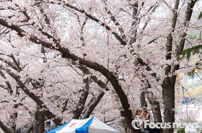 (창원=포커스뉴스) 2일 오후 경남 창원시 진해구 경화역을 찾은 관광객들이 만개한 벚꽃을 보며 즐거운 시간을 보내고 있다.