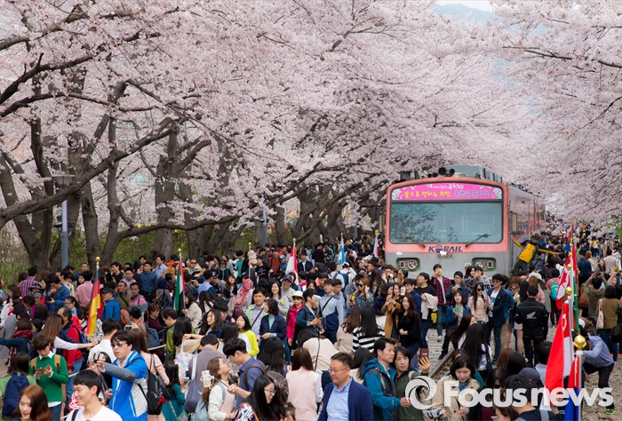 (창원=포커스뉴스) 2일 오후 경남 창원시 진해구 경화역을 찾은 관광객들이 만개한 벚꽃을 보며 즐거운 시간을 보내고 있다.